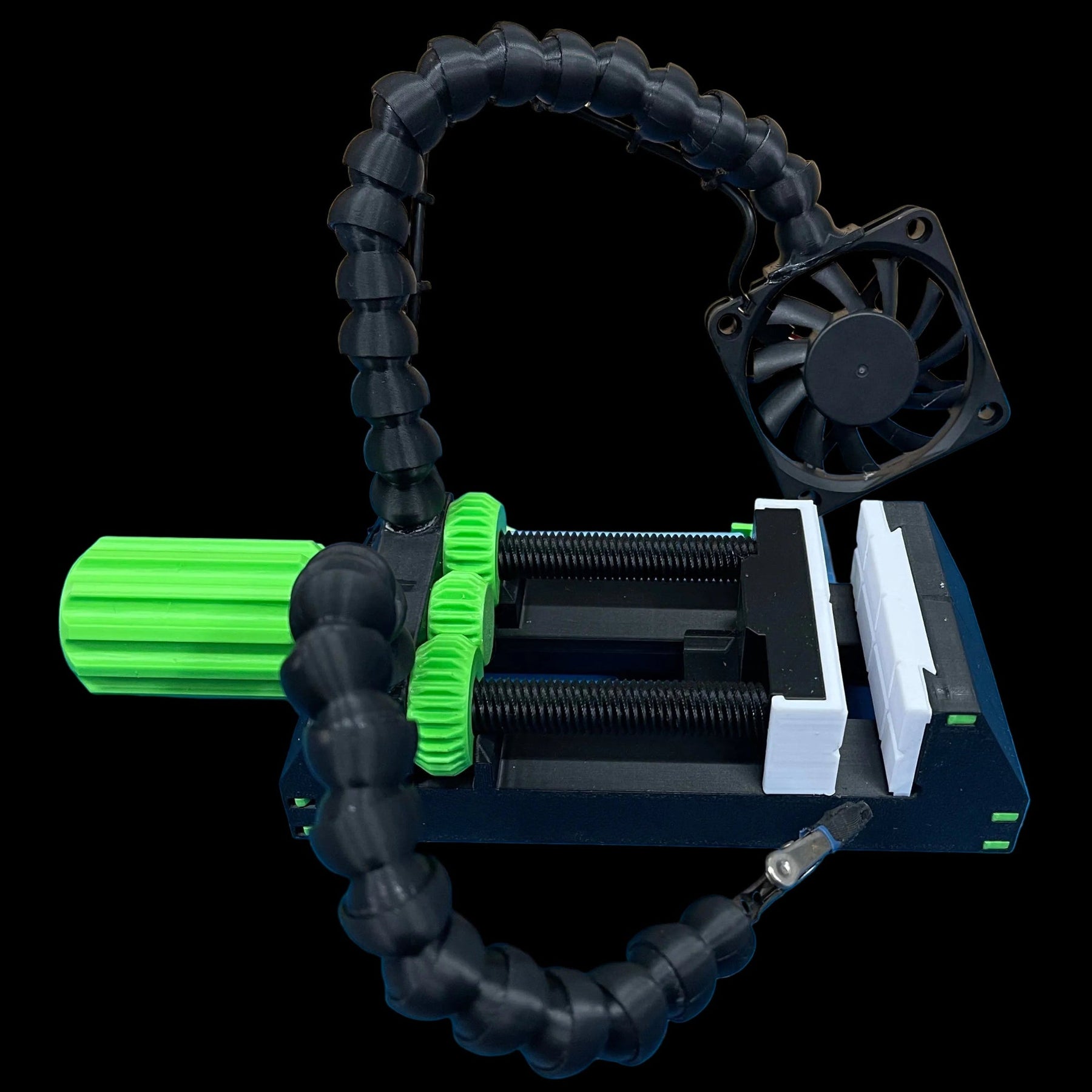 We start off with a simple but functional vice with replaceable jaw inserts. Great for holding small items, connectors or securing stocks, etc. We then equipped it with an alligator clip on a flexible segmented arm that stays where you need it, great for holding wire exactly where it needs to be. We then added a USB powered fan for moving fumes away from your face while soldering.